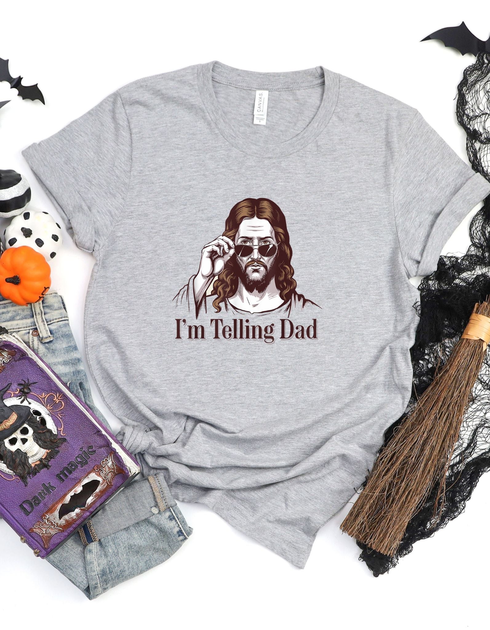 ​Our best-selling graphic tee features a stone-cold Jesus in shades with a classic threat: "I'm Telling Dad."